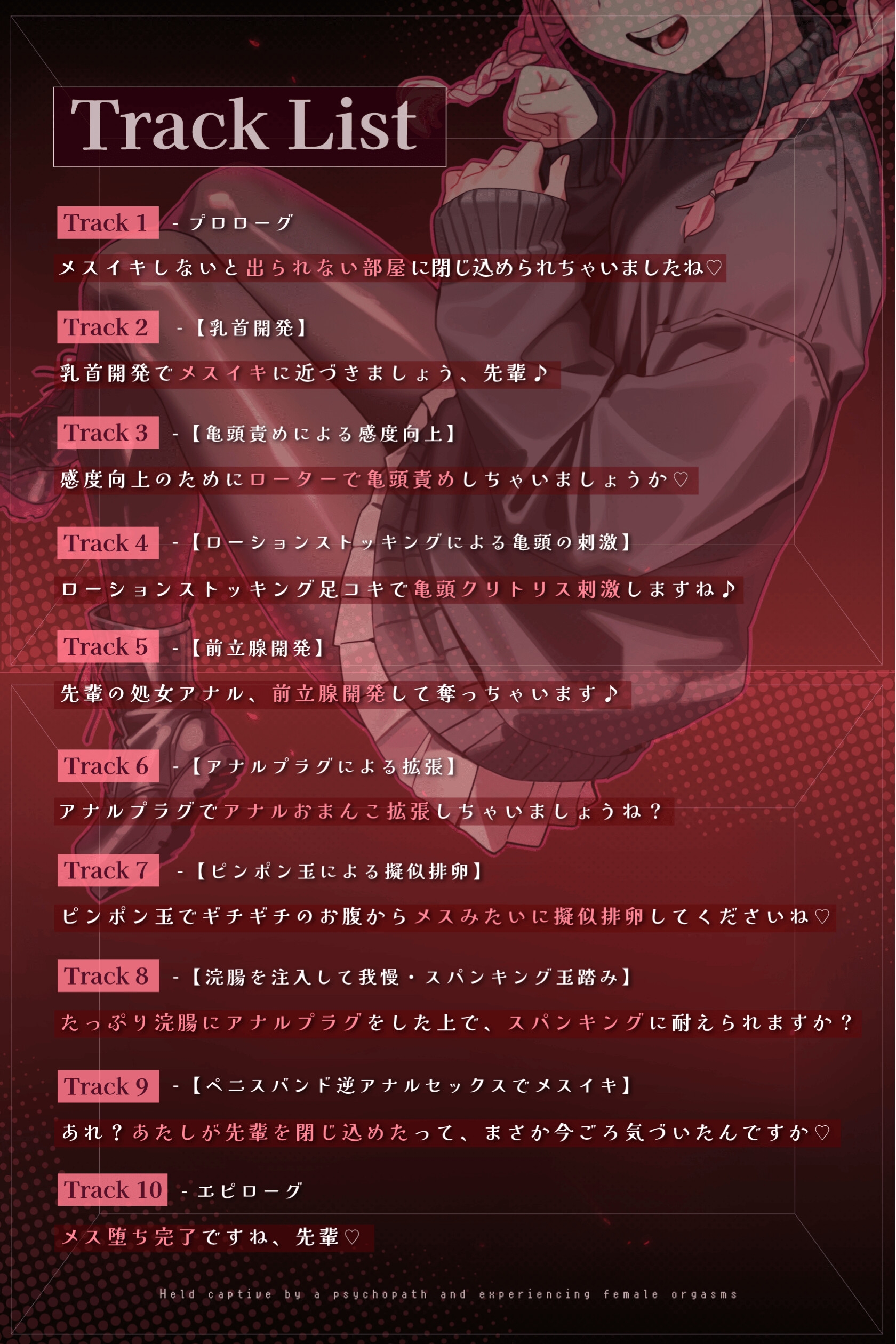 | ジャンル | 逆転無し 先輩/後輩 逆アナル SM 閉じ込め 言葉責め 男性受け メス堕ち |