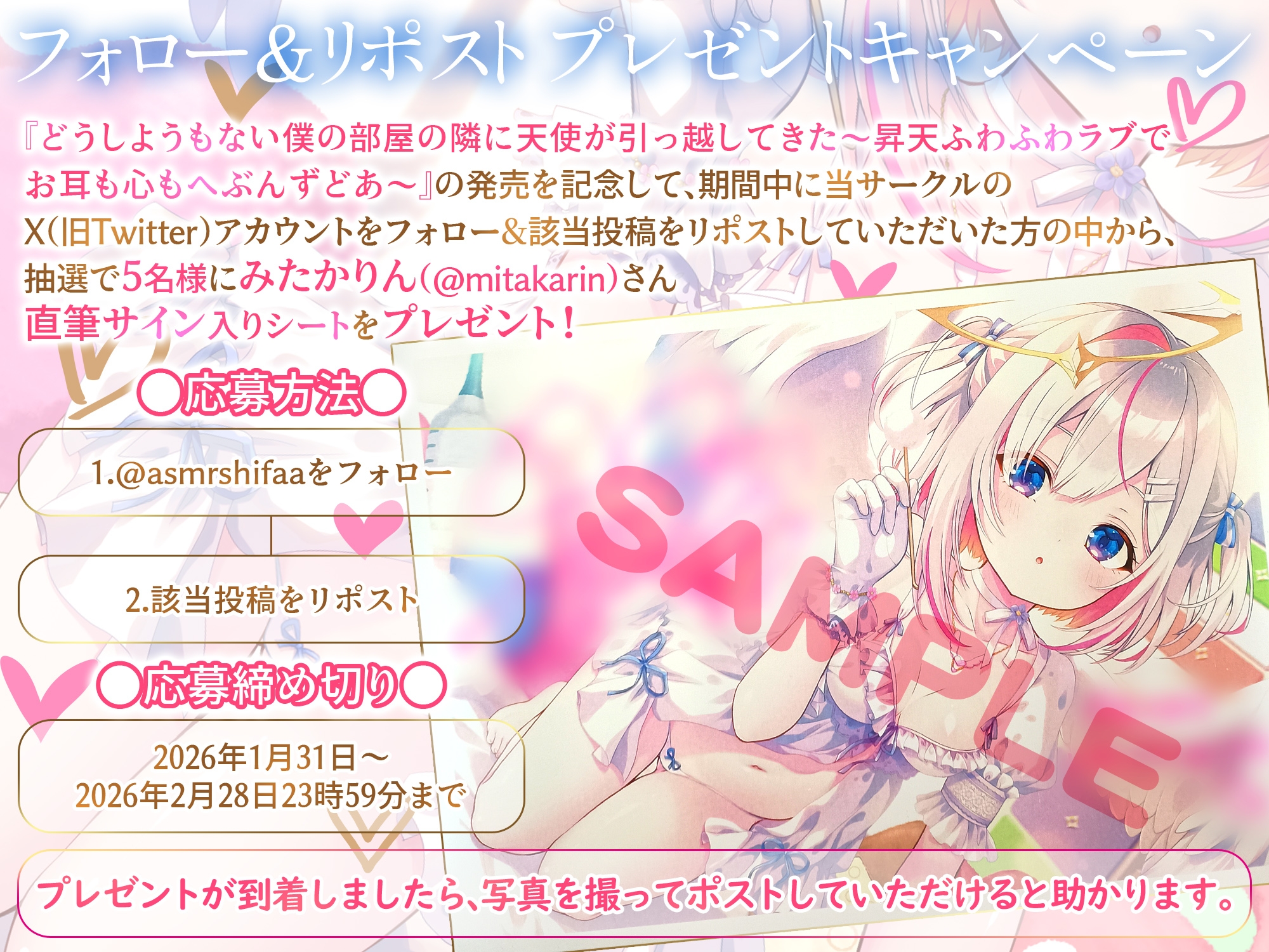 『どうしようもない僕の部屋の隣に天使が引っ越してきた~昇天ふわふわラブでお耳も心もへぶんずどあ~』の発売を記念して、期間中に当サークルのX(旧Twitter)アカウントをフォロー&該当投稿をリポストしていただいた方の中から、抽選で5名様にみたかりん(@mitakarin)さん直筆サイン入りシートをプレゼント!