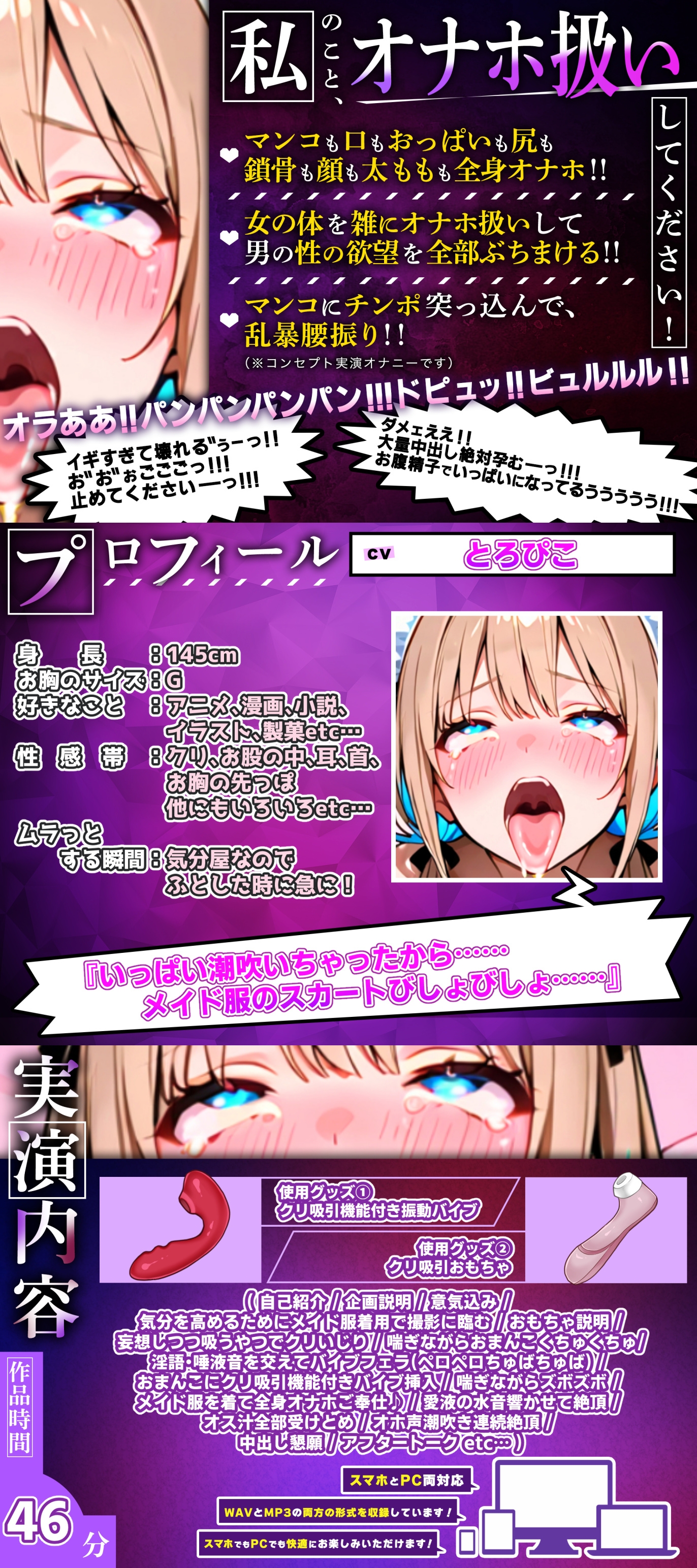 ![【実演オナニー】メイド服で全身オナホ扱いご奉仕!!オス汁全受けとめしながら連続絶頂潮吹き!!『待って……!!イってる!!イってる!! (ぱちゅぱちゅぱちゅ)』 [実演オホ声] 【実演オナニー】メイド服で全身オナホ扱いご奉仕!!オス汁全受けとめしながら連続絶頂潮吹き!!『待って……!!イってる!!イってる!! (ぱちゅぱちゅぱちゅ)』 [実演オホ声]](http://img.dlsite.jp/modpub/images2/parts/RJ01543000/RJ01542796/cde525634e58c4bcad625640a699a903.jpg)